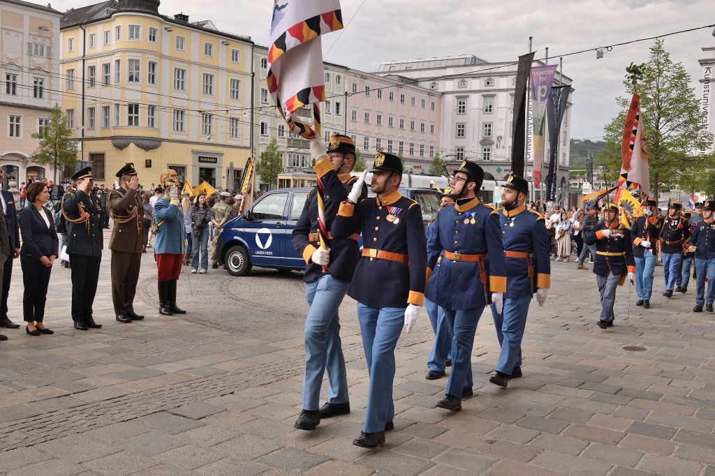 Nach dem Gottesdienst erfolgten der Ausmarsch sowie die Defilierung, bei der die angetretenen Formationen noch einmal geschlossen und eindrucksvoll vor dem alten Rathaus vorbeizogen.