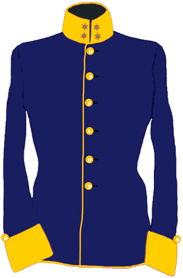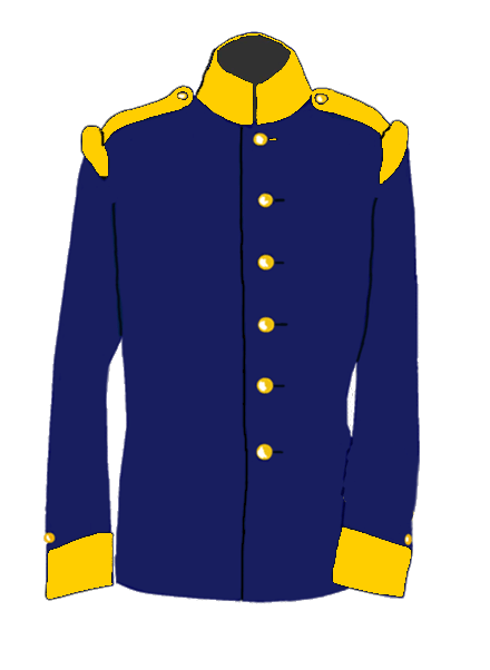 Der Uniformrock ist aus dunkelblauem Tuch mit 3,9 cm hohem, vorn abgerundeten Stehkragen geschneidert worden.